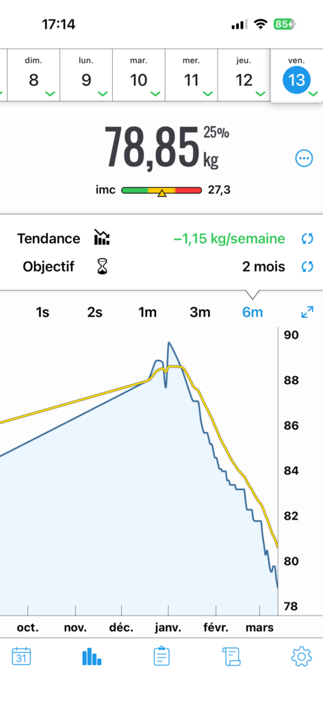 D’après l’application de surveillance du poids , celui-ci atteindre l’objectif de 70 kg dans 2 mois. Si c’est dans 3 mois , ça me satisferai aussi.